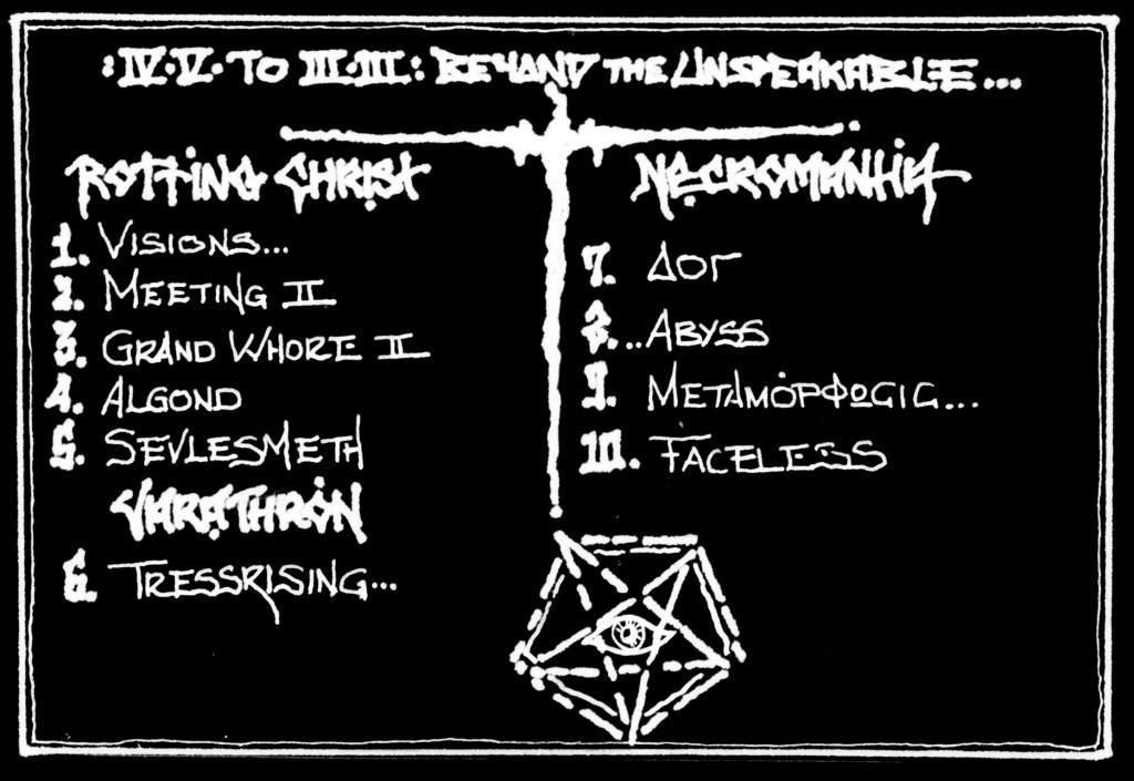 Το σκεπτικό ακρόασης, ίδιο με τις δυο κασέτες που είχαμε αρχικάανεβάσει από αυτό το blog: • Εφτάρια των 45 στροφών παιγμένα στις 33. “Αποκαθήλωcις”, split με MonvmentvM, “From the Past we Summon Thee” • Δωδεκάρια και βινυλιοποιημένες κασέτες στην “καλίμπρα” του χαλαρωμένου ιμάντα. “Passage to Arctvro”, “Black Arts/Everlasting Sins”, Promo MCMXC.