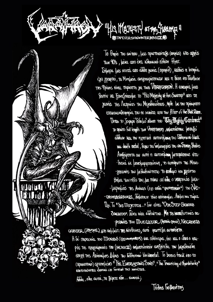Στο “Into the Catachthonium” θα βρούμε το ντεμπούτο του ’94 και το Ep του ’92, άρα την βασική δράση των Ιταλών όταν έγραφαν ιστορία στο underground. Το Black Metal των Mortuary Drape οφείλει πολλά σε Venom, Mercyful Fate, το thrash των late 80’s αλλά και τα soundtrack των Ιταλικών θρίλερ. Πέρα από αυτά, είναι βαπτισμένο στον ελληνικό ήχο, όπως αυτός διαμορφώθηκε από Νecromantia, Varathron και Rotting Christ. Το άρτιο κέντημα όλων τα παραπάνω εμφανίζει μια λαμπυρίζουσα προσωπικότητα, που θα ήταν τελικά δίκαιο να θεωρηθεί αυτόνομη. Δομικά το heavy riffing κρατά τα γκέμια στ’ άλογα του occult άρματος. Μελωδικά περάσματα και ουσιαστικά samples χρωματίζουν την πλοκή ενώ η χρήση γυναικείων φωνητικών μας μεταφέρει πέρα μακριά από σκοτεινούς αιώνες στις παρυφές του Άδη. Η ουσία της ομίχλης που πλουμίζουν τα συγκεκριμένα μοτίβα είναι καθοριστική για το μεγαλείο των Ιταλών. Το βασικό χαρακτηριστικό του χθες είναι παρόν. Μια κιθάρα παίζει μπροστά από το ρυθμικό μέρος, δημιουργώντας άδειο «χώρο» (λυπάμαι που ενώ υπήρξε αναβίωση του ελληνικού ήχου, ακόμα δεν το είδα σαν εφαρμογή), παράλληλα αυτό που κάνουν με τα solos είναι αξιοσημείωτο. Γιατί το solo σαν τρόπος παιξίματος είναι πολύ μακριά από το μαυρομεταλλικό ύφος και ήθος (solo=επίδειξη και όχι ουσία) και οι Ιταλοί κατάφεραν περίφημα να το εντάξουν χωρίς να γλασάρουν την πλοκή. Το μπάσο είναι σημείο αναφοράς και δουλεύει πολύ (περισσότερο στο Ep “Into the Drape”) ενώ τα φωνητικά έχουν αυτή τη βαθιά και παχιά άρθρωση που εν μέρη μπουκώνει αλλά τελικά βοηθά το σύνολο να κοντέψει το μνήμα απ’ τον περίβολο. Εκτιμώ, πως το παλαντζάρισμα metal ρυθμός/ατμόσφαιρα δεν αναιρούσε την σκιά τότε, ενώ στο σήμερα έχει σημεία που τα λες και cheesy. Το πάντρεμα αυτό ήταν όμως ο σκοπός, ήθελαν την ενσωμάτωση και είναι καταδεκτικό του τρόπου που έγραφαν. Εδώ έχουμε ιστορία, που αναφέρει τις δύο αυτές κυκλοφορίες στην ομάδα εκείνων που δημιουργούσαν την οπτική. Με λίγα λόγια, έτσι οδηγήθηκε το heavy metal στο σκοτάδι και αργότερα απέκτησε την αυτόνομη δύναμη να σκουρύνει οριστικά. Οι Mortuary Drape είναι ένα σχήμα που στα πρώιμα χρόνια είχε περιβληθεί καπνούς μυστηρίου σχετιζόμενο με αίρεση. Είναι δεκάδες οι φήμες για μέλη πτωμάτων επί σκηνής αλλά και οι εικασίες (κάποιες ήταν αλήθεια, στο μέτρο του επιτρεπτού) για τα Live που έκαναν. Ωστόσο το βασικό μοντέλο κεριά, κουκούλες και απόκρυφα διακριτικά έζησε από το χθές μέχρι και το σήμερα..